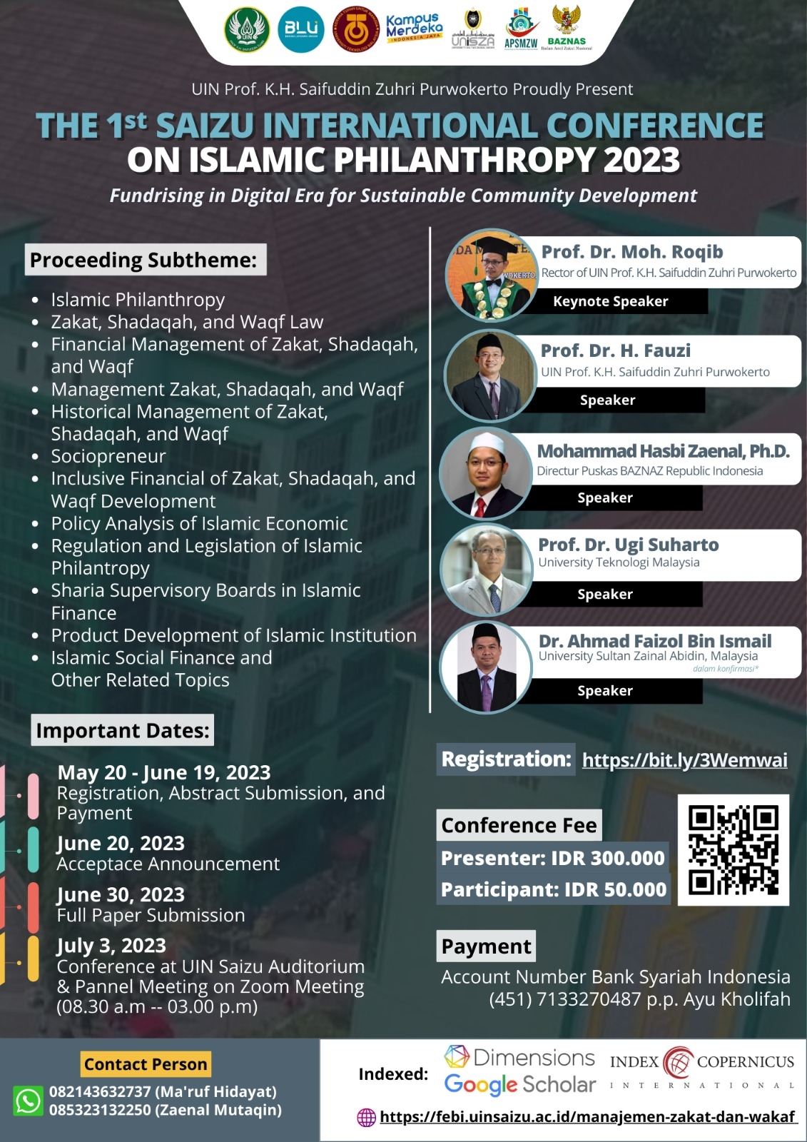 On July 3, 2023, UIN Prof. K.H. Saifuddin Zuhri Purwekorto organized the 1st International Conference on Islamic Philanthropy with the theme "Fundraising in the Digital Era for Sustainable Community Development". The event featured four speakers, one of whom was Mr. Mohammad Hasbi Zaenal, Ph.D., the Director of Zakat Research and Development at BAZNAS RI. The other speakers included Prof. Dr. H. Fauzi from UIN Prof. K.H. Saifuddin Zuhri Purwekerto, Prof. Dr. Ugi Sugiharto from the University of Technology Malaysia, and Dr. Ahmad Faizol Bin Ismail from the University Sultan Zainal Abidin, Malaysia.