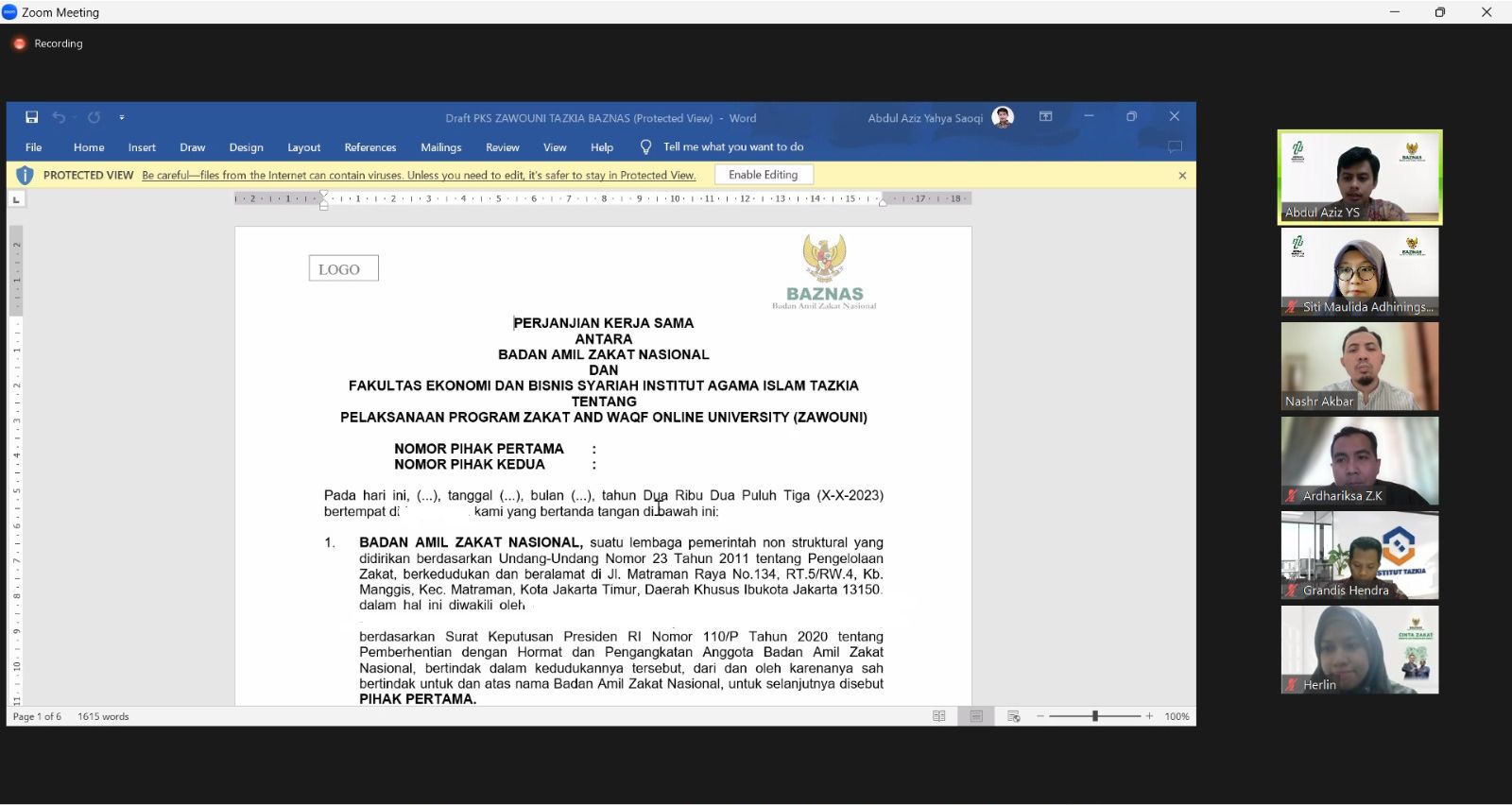 BAZNAS RI Held an Online Coordination Meeting with IAI Tazkia Regarding the Cooperation Agreement of Zakat Waqf Online University (ZAWOUNI)