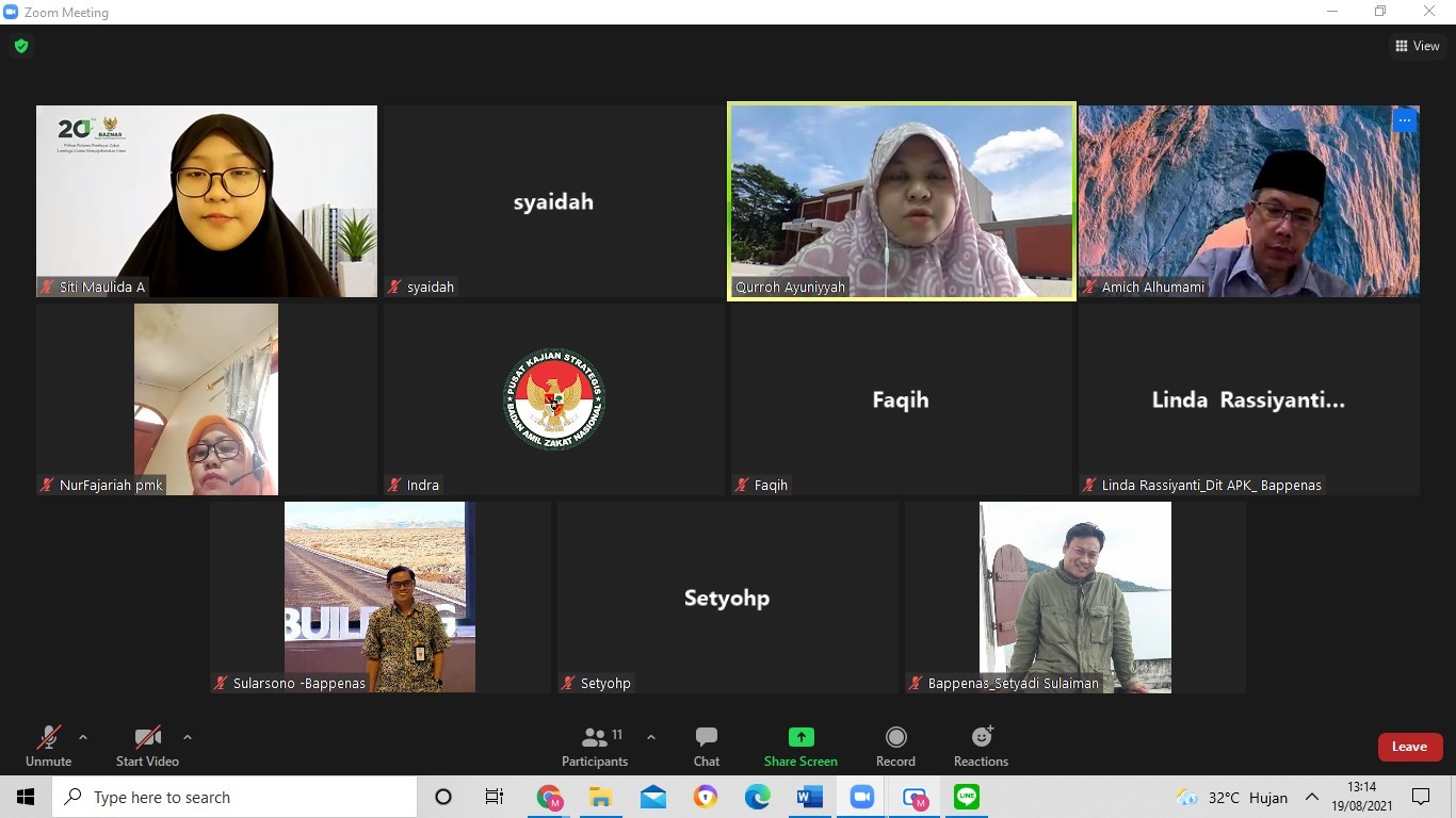 On Thursday (19/08/2021), Puskas BAZNAS discussed forming a national zakat coordination index through an online platform. The purpose of this discussion is to gain knowledge from government institutions that have carried out the coordinating function, namely the National Development Planning Agency and the Coordinating Ministry for Human Development and Culture.