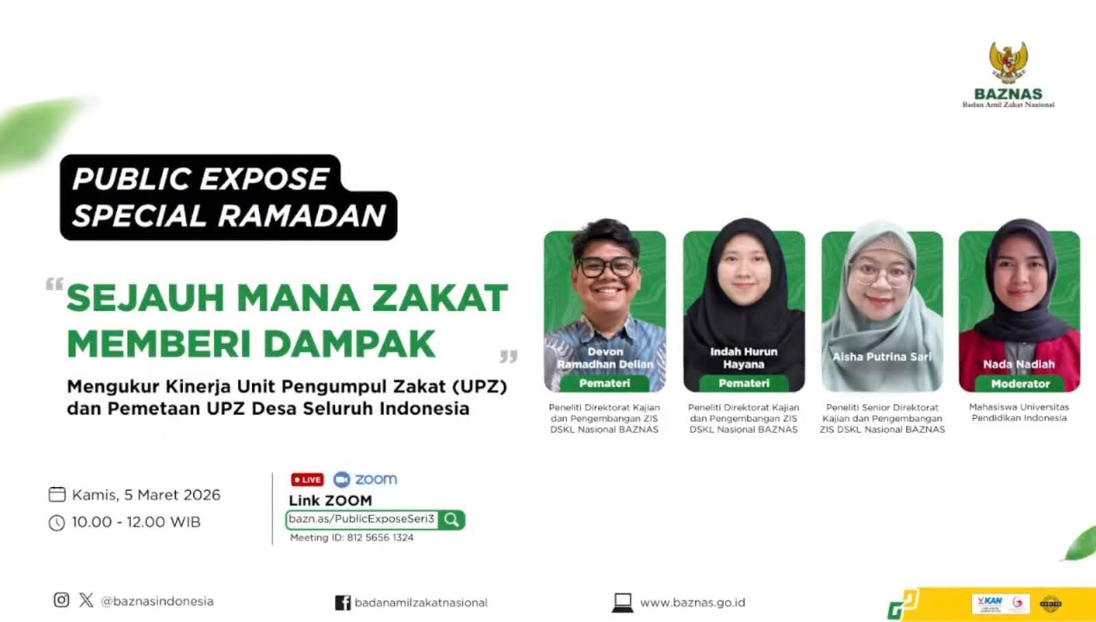 Jakarta, March 5, 2026 – The National Zakat Agency (BAZNAS), through the Directorate of ZIS-DSKL Research and Development, held a Special Ramadan Series Public Expose with the theme “How Far Does Zakat Have an Impact?”. This activity was conducted online as part of the BAZNAS Ramadan Program and was attended by zakat administrators, academics, and the general public.