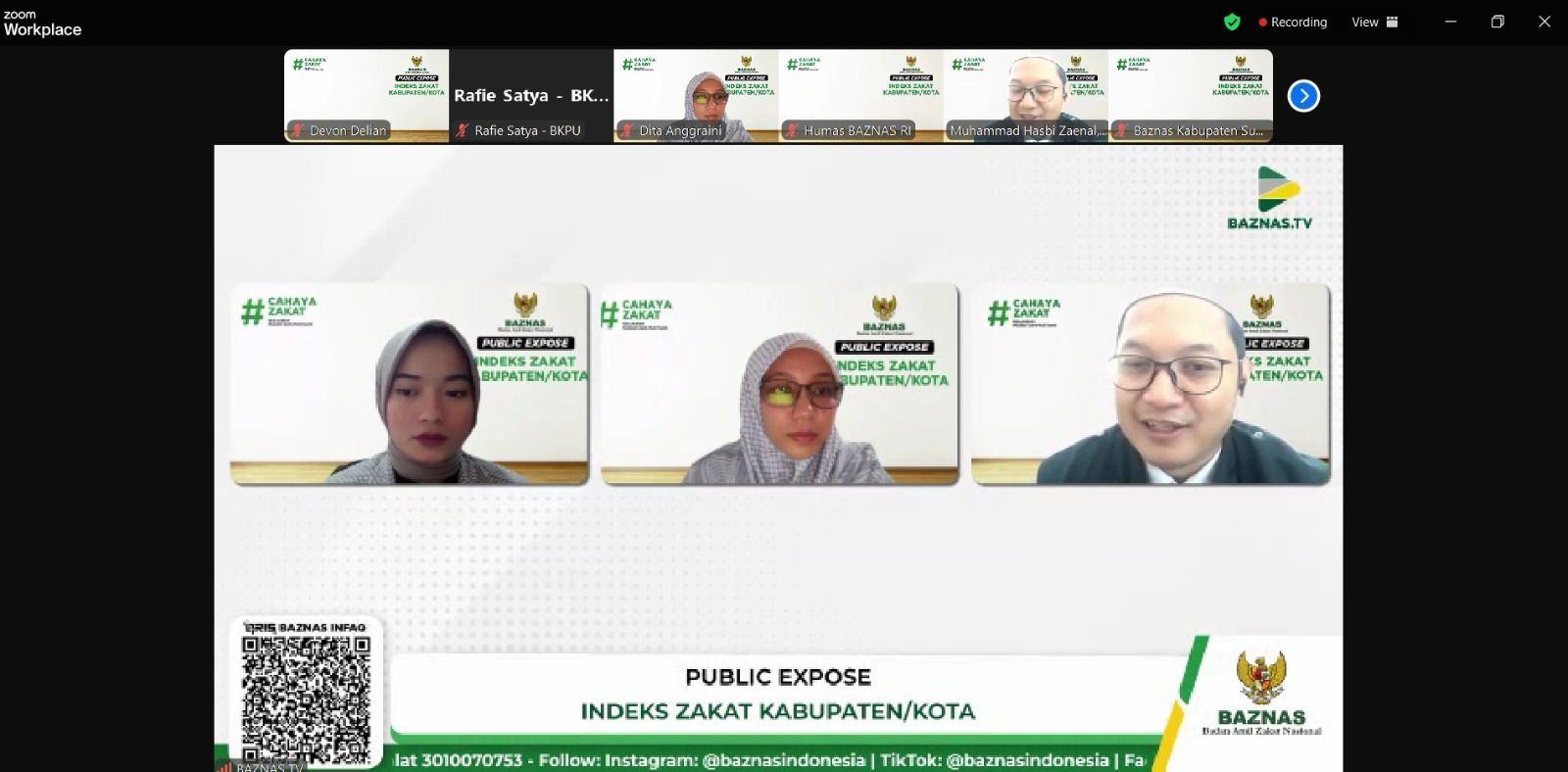 [Jakarta, Indonesia] - Friday, February 28, 2025, the National Board of Zakat (BAZNAS), along with Amil Zakat Institutions (LAZ) from various regions, participated in the Public Expose: Zakat Regency/City Index (IKKZ), which was conducted online via the Zoom Meeting platform. The event was opened with remarks by the Director of National ZIS-DSKL Studies and Development, Mr. Muhammad Hasbi Zaenal, Ph.D., followed by a presentation by Mrs. Dita Anggraini, S.E.