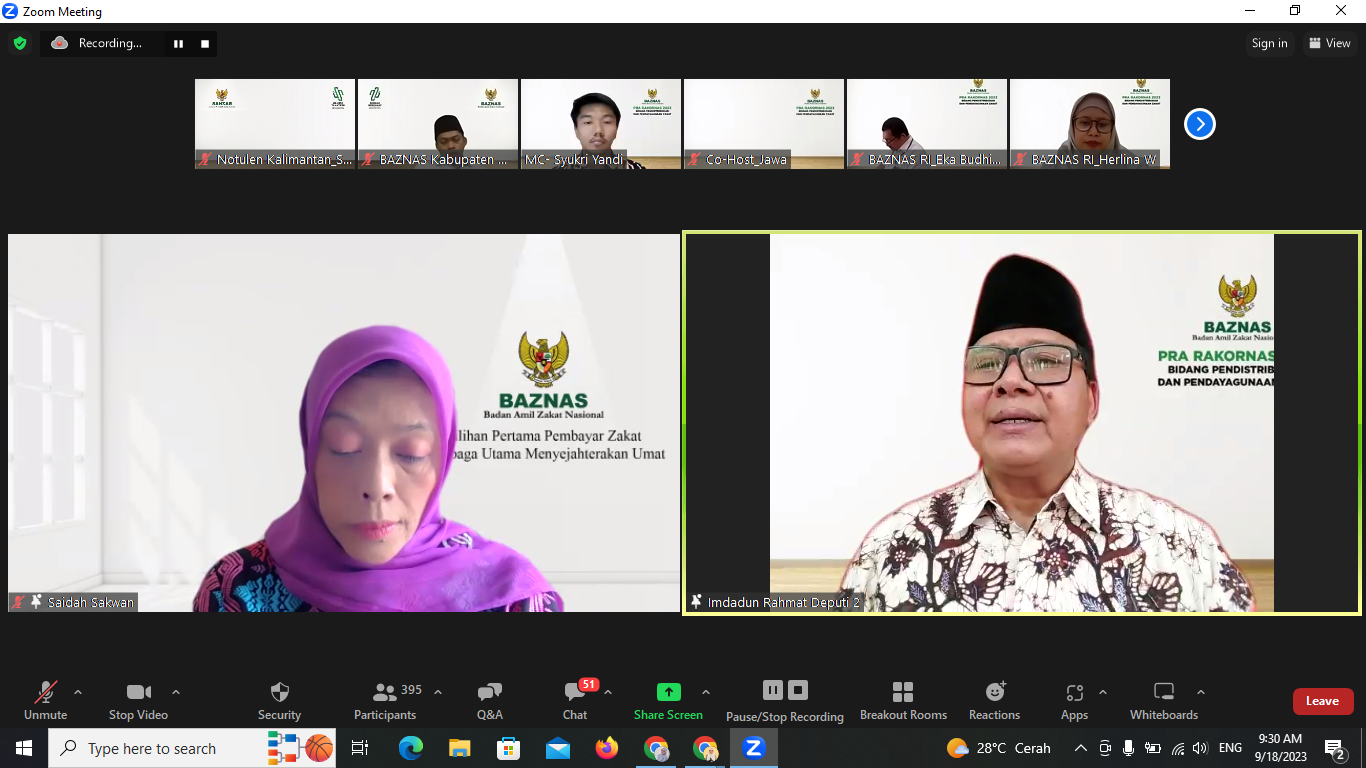 On September 20, 2023, a Pre-National Coordination Meeting for Distribution was held as part of the activities preceding the National Coordination Meeting of BAZNAS 2023. The event took place online via Zoom Meeting and was attended by the Commissioner of the National Board of Zakat (BAZNAS), directors, bureau heads, and staff of BAZNAS RI, also all BAZNAS provinces and districts/cities across Indonesia.