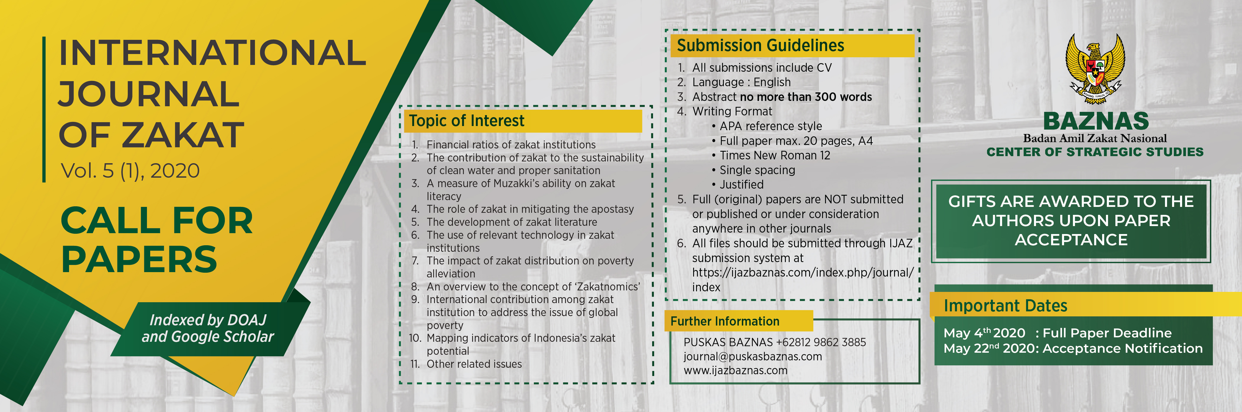 The editorial team of IJAZ is now inviting the academics, industry professionals, and other related stakeholders to submit their scholarly works on zakat. The submission aims at IJAZ volume 5 number 1 2020. This issue considers the original works with the main references from the recent books published by the Center of Strategic Studies, the National Board of Zakat, Republic of Indonesia (Puskas BAZNAS).
