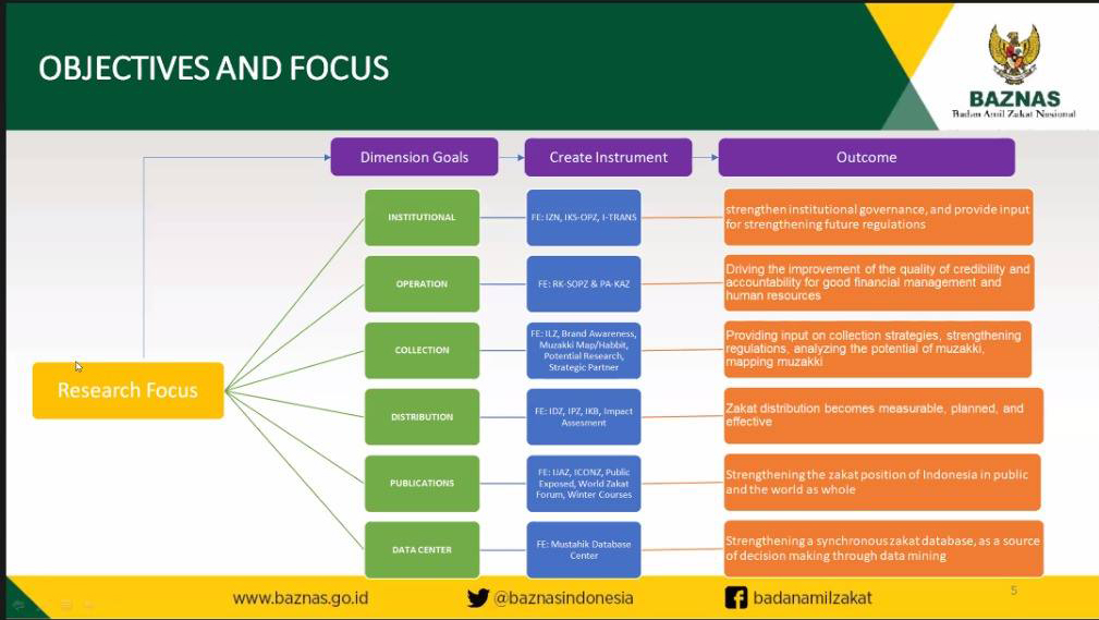 Starting of his presentation, 2011 law no. 23 on zakat management in Indonesia was launched. This law regulates the centralized management of zakat which covers all parts of Indonesia. After the enactment of this law, Indonesia has become the country with the largest zakat management coverage in the world, which regulates zakat management for 229.62 million Indonesian Muslim population with an area of 1,922,570 km². Thus, BAZNAS established BAZNAS Center of Strategic Studies (Puskas BAZNAS) which is tasked with these supporting above.