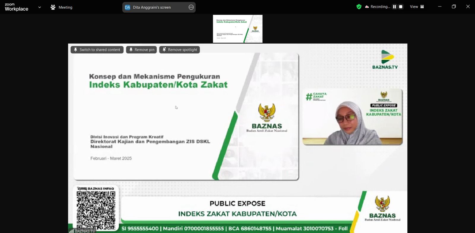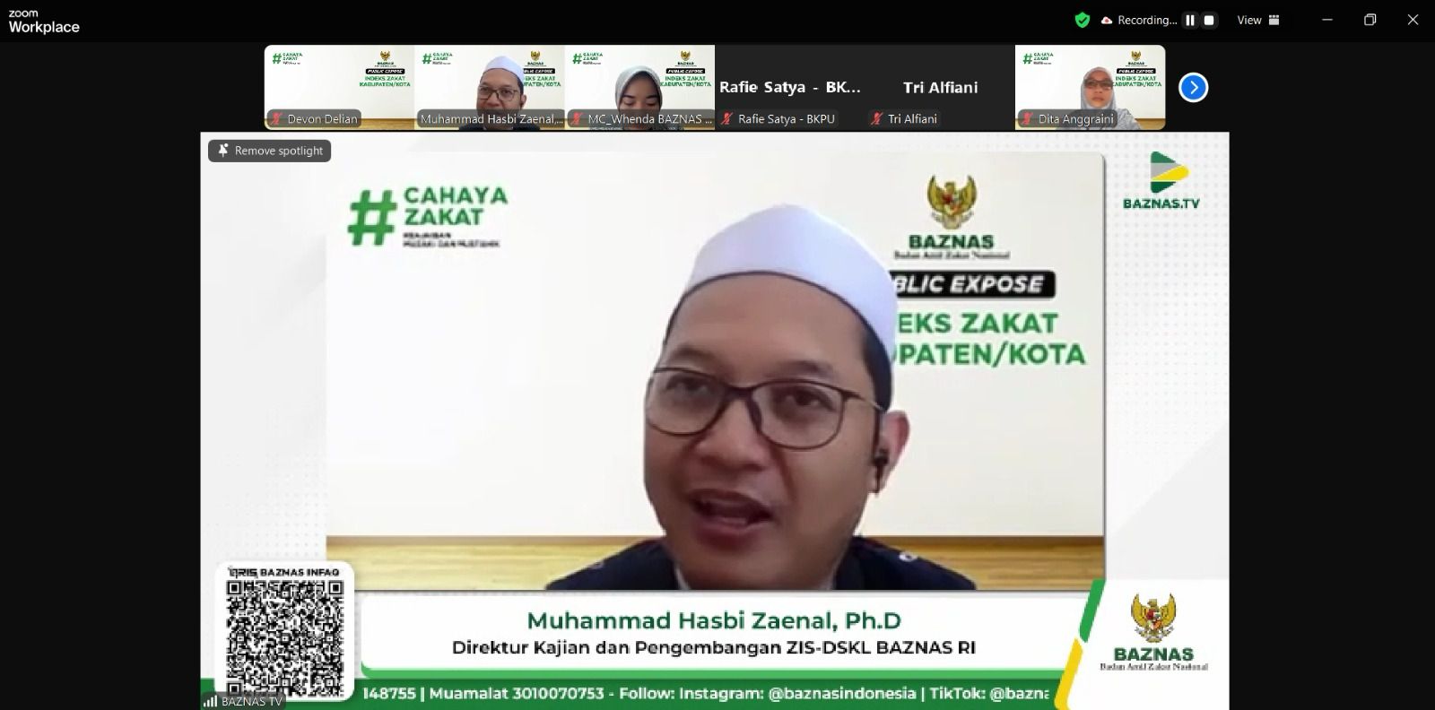 [Jakarta, Indonesia] - Friday, February 28, 2025, the National Board of Zakat (BAZNAS), along with Amil Zakat Institutions (LAZ) from various regions, participated in the Public Expose: Zakat Regency/City Index (IKKZ), which was conducted online via the Zoom Meeting platform. The event was opened with remarks by the Director of National ZIS-DSKL Studies and Development, Mr. Muhammad Hasbi Zaenal, Ph.D., followed by a presentation by Mrs. Dita Anggraini, S.E.
