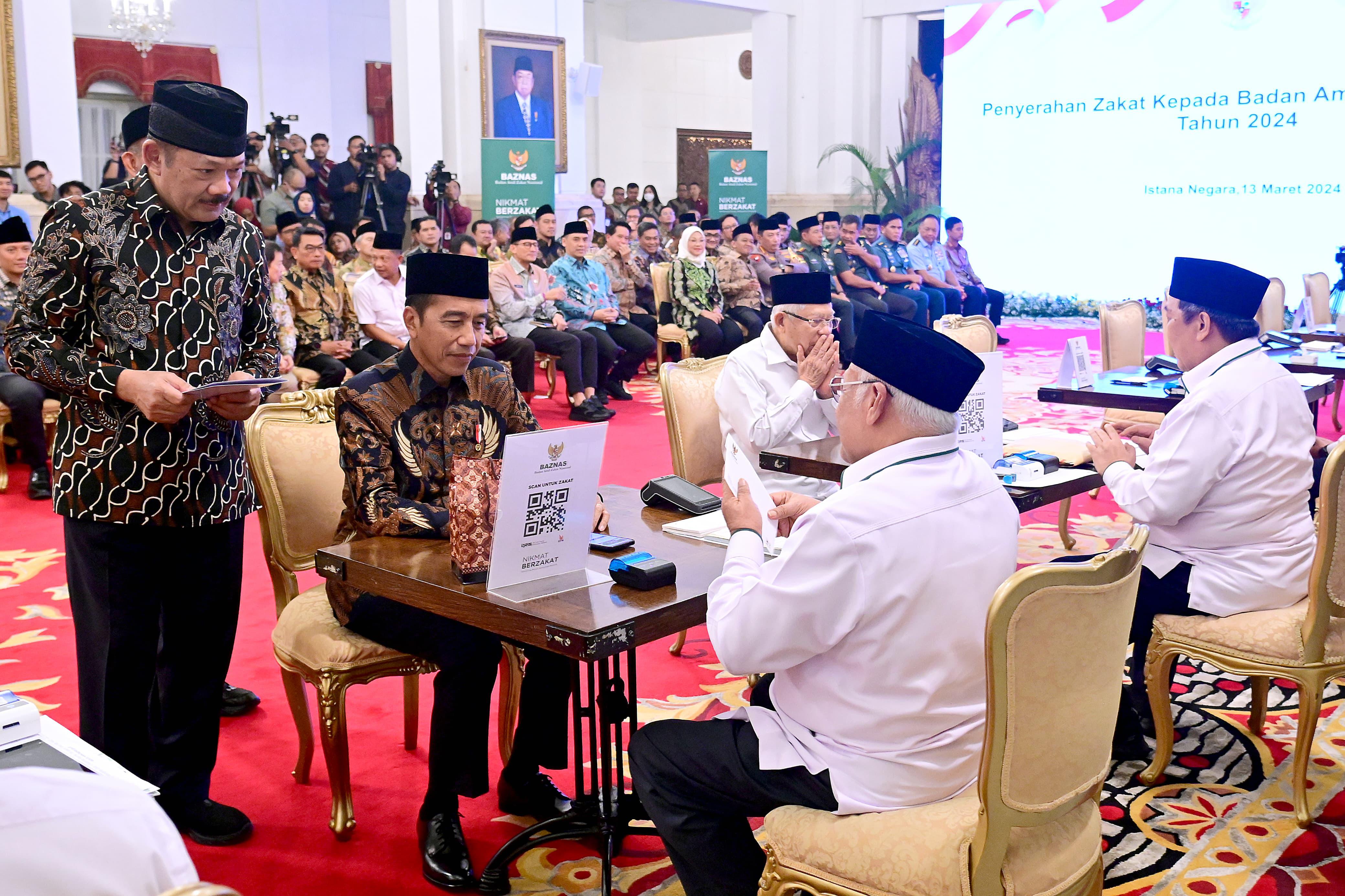 The President of the Republic of Indonesia, Mr. Joko Widodo together with Vice President Mr. Ma'ruf Amin and several of ministers of the Advanced Indonesia Cabinet submitted zakat through the National Board of Zakat (BAZNAS) at the State Palace, Central Jakarta, on Wednesday 13 March 2024. At the location, officers from BAZNAS were already sitting at their respective service desks. The tables are lined up and opposite the seats of the ministers and heads of institutions. The President Mr. Jokowi, Vice President Mr. Ma'ruf Amin, Coordinating Minister for Human Development and Culture Mr. Muhadjir Effendy, and Chairman of BAZNAS RI Mr. Noor Achmad sat at the front.