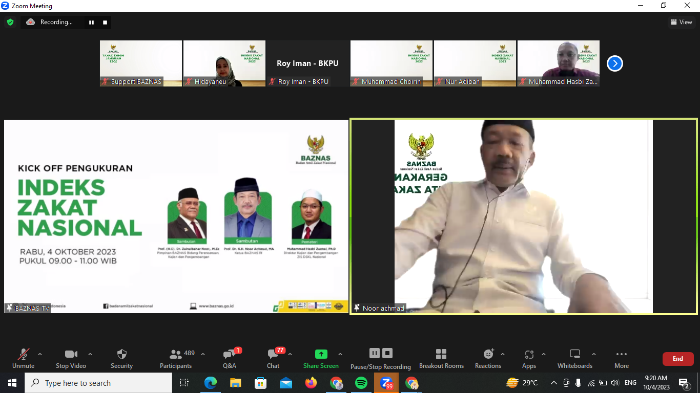 On 4th October 2023, the Kick Off Measurement of National Zakat Index (IZN) 2023 was carried out in the early morning via an online Zoom Meeting. The commencement of the IZN 2023 measurement was presided over by Prof. DR. K.H Noor Achmad, MA ,the Chairman of The National Board of Zakat of Republic Indonesia (BAZNAS RI), who delivered an opening speech to inaugurate the event. In addition to his opening remarks, he also conveyed several important points. IZN 2023 will be measured based on the programs we intend to assess, and the components will be assessed collectively. This is because the components will continually evolve in accordance with the developments and demands arising from our collaborative efforts. Furthermore, there are four areas of strengthening, as I have previously mentioned: Institutional Strengthening, Management Strengthening, Human Resources Strengthening, and Networking Strengthening as it is through these aspects that we will measure the IZN.